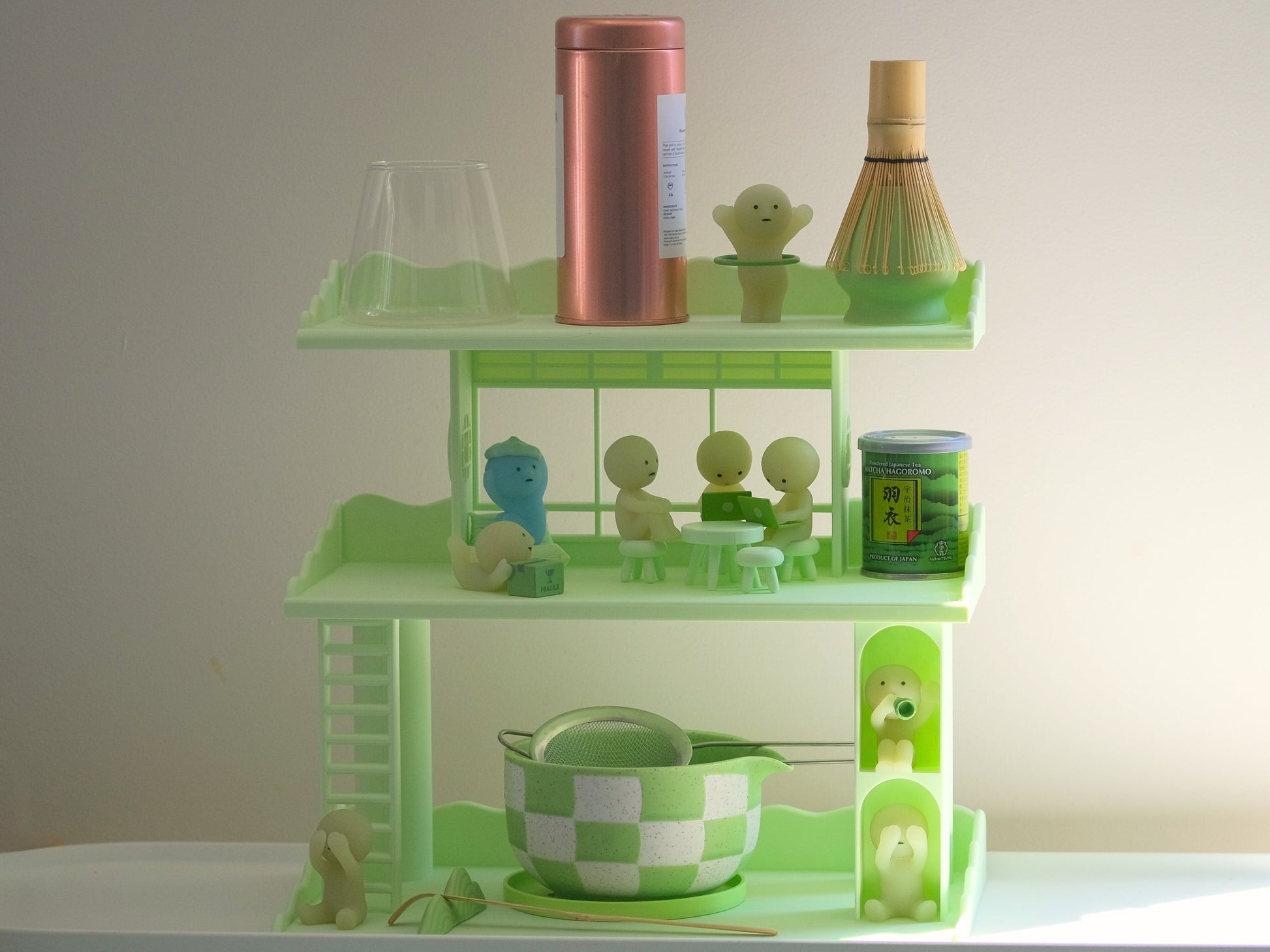 The display comes with a table and four chairs, and togo couch as well as the Smiski saucer plate beneath the Chawan.